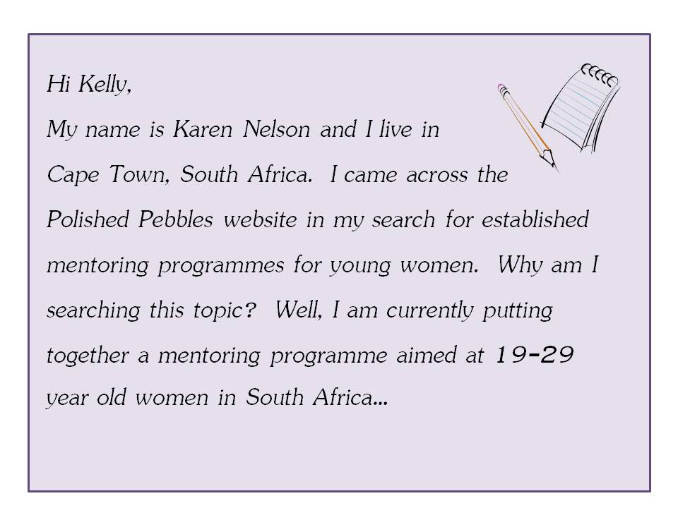 When I started reading this email message I received from Karen Nelson, I was astounded. I work hard to share content and ideas that people find useful and engaging here on “KellyFairTheMentor.” And, it was so rewarding and surprising to get a note from someone who was reading our blog, and who found me all the way in South Africa! Karen and her friend Hayley have partnered to begin establishing a mentoring program in their community in South Africa. They’re in the very early stages of developing and implementing their pilot program, but they’ve done a whole lot of research, identified partners in the community, and have been working on building their curriculum.