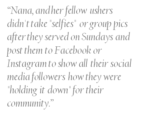 In today’s society, it’s easy to understand that many of us are just “keeping are heads above water.”  Many of us are primarily focused on economic and professional attainment to improve the status for ourselves and our immediate families.  In this new millennium, it’s hard to imagine how anyone can keep a commitment to a volunteer position for 63 years, when it seems staying with the same job, and most marriages don’t make it for 5-10 years.  But, with the challenges were having in our community with violence, poor education, and struggling family and community infrastructures, how can we not find time to tithe our time much in the way that Nana, and many of our parents, grand parents, and elders did?  We are who we are today and experience the success and freedoms we do, because  our elders made a sacrifice to tithe their time, talents, and service to the betterment of their community and the betterment of their future us.  What a self-less investment?  Nana, and her fellow ushers didn’t take “selfies” or group pics after they served on Sundays and post them to Facebook or Instagram to show all their social media followers and fans how they were “holding it down” for their community.  Nope, they just did the work often with no obvious recognition.  Service was a part of their lifestyle.