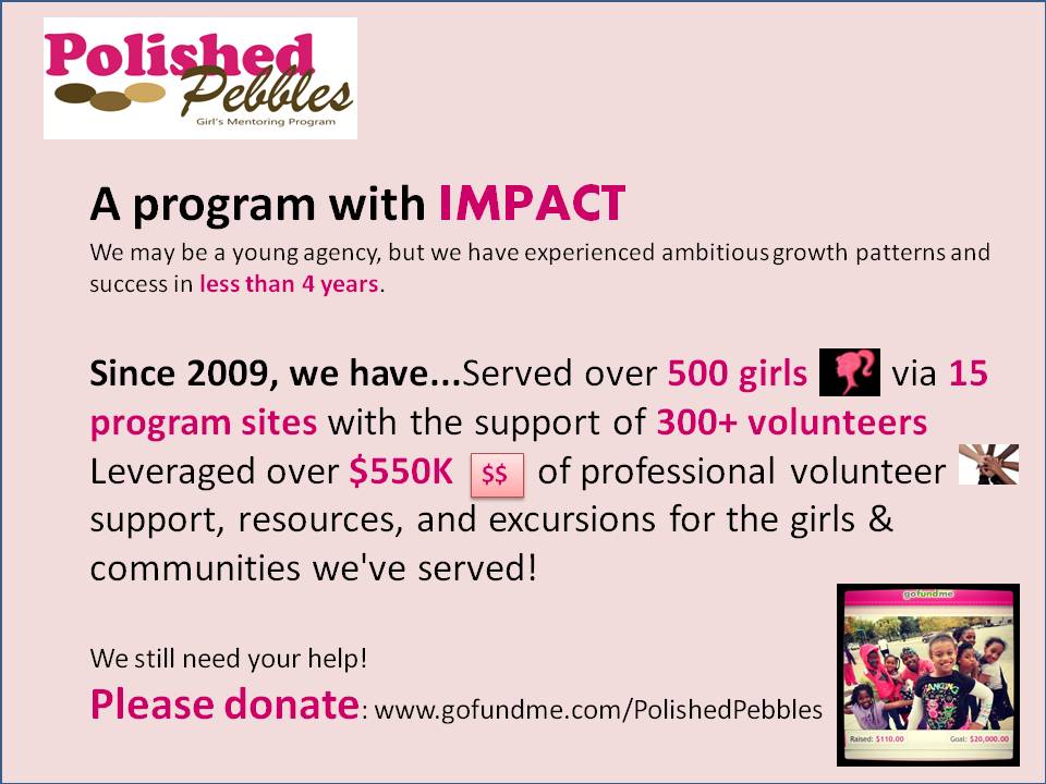 Polished Pebbles is a Chicago-based, nonprofit organization that I founded back in 2009, and provides me with a lot of the insight, experiences, and food for thought for this blog. The Polished Pebbles program mentors girls ages 7-17 on the effective life skill of communication.We have worked with over 300+ volunteer mentors who help approx. 700 girls via 21 program sites to solve their problems rationally as opposed to retaliating and develop the confidence to: